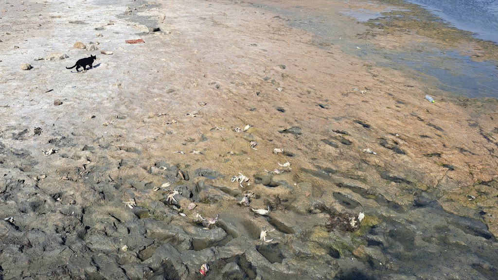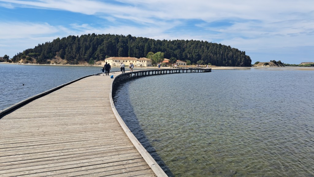 El otro taxista en Vlorë, a comparación de nuestro amigo taxista en Fier, nos cobró un ojo de la cara, qué pena que no encontráramos a un amigo albanés que le advirtiera de no timarnos. El de Vlorë comentó que su taxímetro no funcionaba. Además, nos dijo de buenas a primeras el precio por el trecho, al final nos dimos cuenta de que el viaje duró unos doce minutos, pero lo que nos cobró fue casi lo mismo que el taxista que nos llevó a Apolonia y que además nos esperó dos horas. Sobre aquel escribo aquí arriba. Arribamos cruzando un puente de madera, un puente muy descuidado que nos llevó al Monasterio de Zvernec, el de Santa María. El agua en la isla del monasterio apenas cubría la orilla de la que no tenía casi nada de agua, el puente parecía innecesario. Unos cangrejos descansaban muertos en la arena. Un gato paseaba por allí indiferentemente. Era negro. Nuestro retorno a Vlorë fue a pie. Mi hijo quería ir primero a alguna playa para despedirse, buscó en internet y encontramos una playa cercana que estaba limpia y vacía. Esta vez sí nos sirvió Google Maps para llegar allí. No tomamos taxi alguno, mi hijo no quería volver a ver a ese timador taxista. Escapando de éste, llegamos a la mejor playa de nuestro paseo en Albania y nos preguntamos si sería privada o pública, no fuera a ser como en Italia y muchas veces como en el Perú. Ese día lo disfrutamos inmensamente, era septiembre, no hacía tanto calor, el mar arrullaba a los cuatro gatos de la playa. ¡Esta vez sí personas, no gatos! Al final tomé algunas fotos y seguí el paso de mi hijo con sus zapatillas en la mano a la orilla del mar.